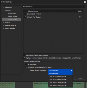 For example, you have an Intensity Pro 4K which can do UHD @ 25P but a screen that only does HD, then you can tell EDIUS to convert the video output to a maximum of HD – less than the Intensity Pro supports but the maximum the TV supports.